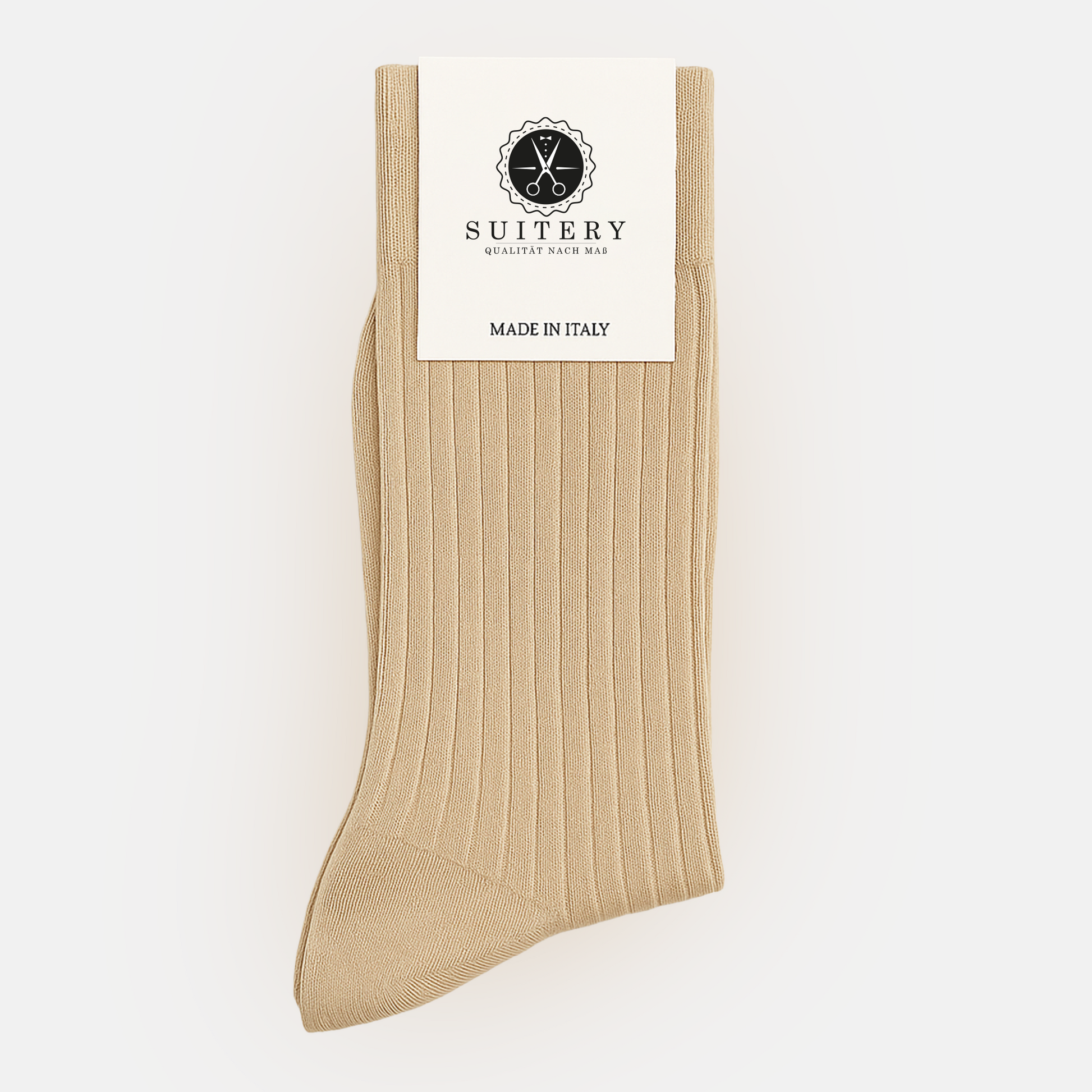 Anzugssocken Rib von Suitery bestehen aus 85% hochwertiger Baumwolle, 3% Elasthan und 12% Nylon. Diese Materialkombination sorgt für optimalen Tragekomfort, eine perfekte Passform und langlebige Elastizität. Die feine Rippstruktur verleiht den Socken eine elegante Optik, die ideal zu formellen Anzügen passt. Atmungsaktiv und strapazierfähig, sind sie die perfekte Ergänzung für anspruchsvolle Business- und Festtagsoutfits.