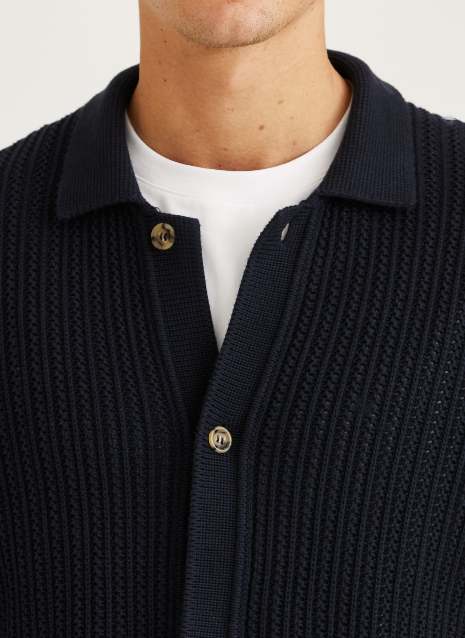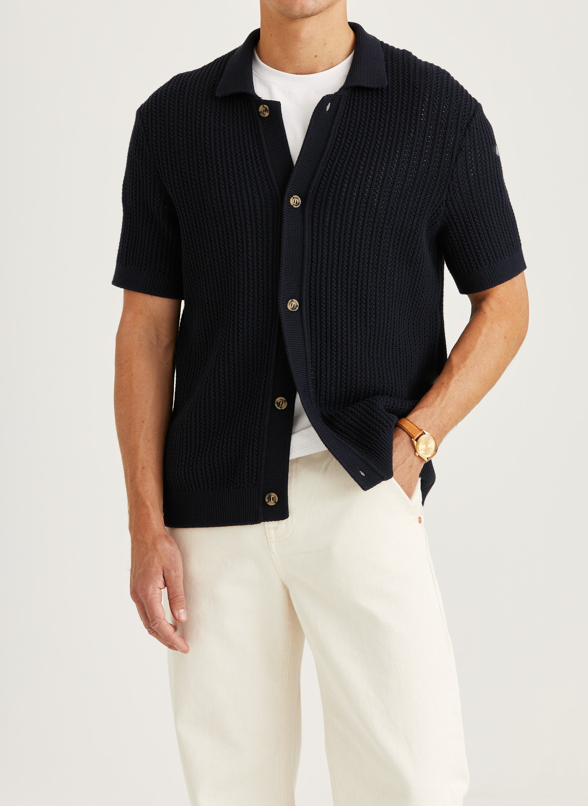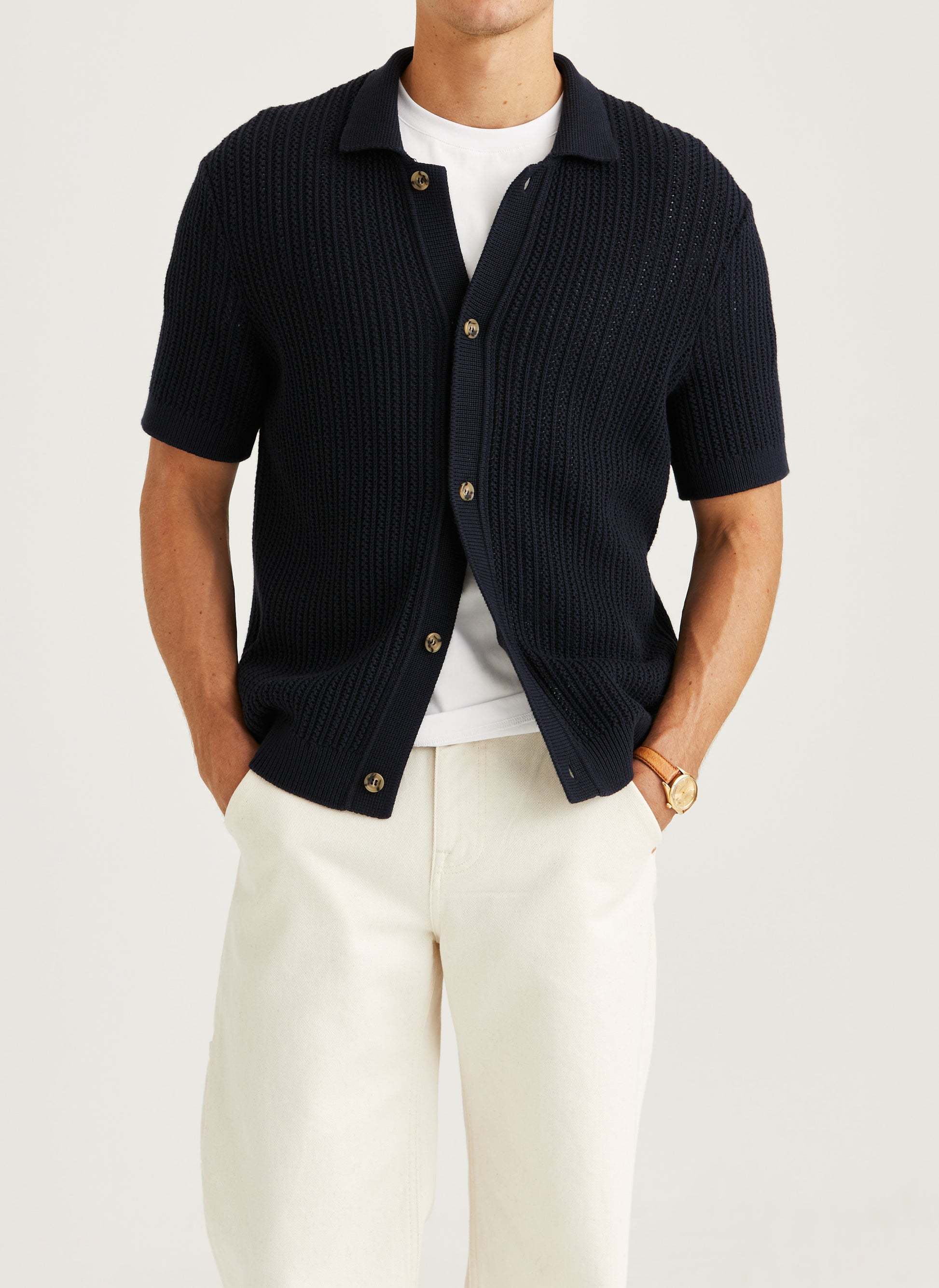 Das perforierte Strickmuster sorgt nicht nur für eine besondere Textur, sondern auch für hohe Atmungsaktivität – ideal für warme Tage und stilbewusste Auftritte.