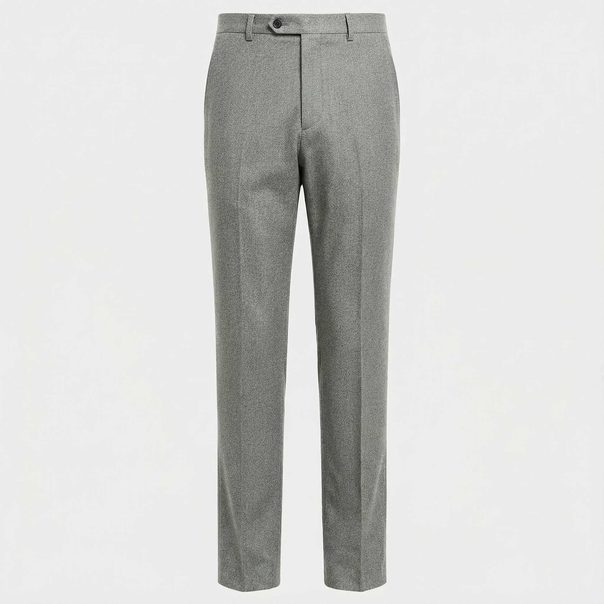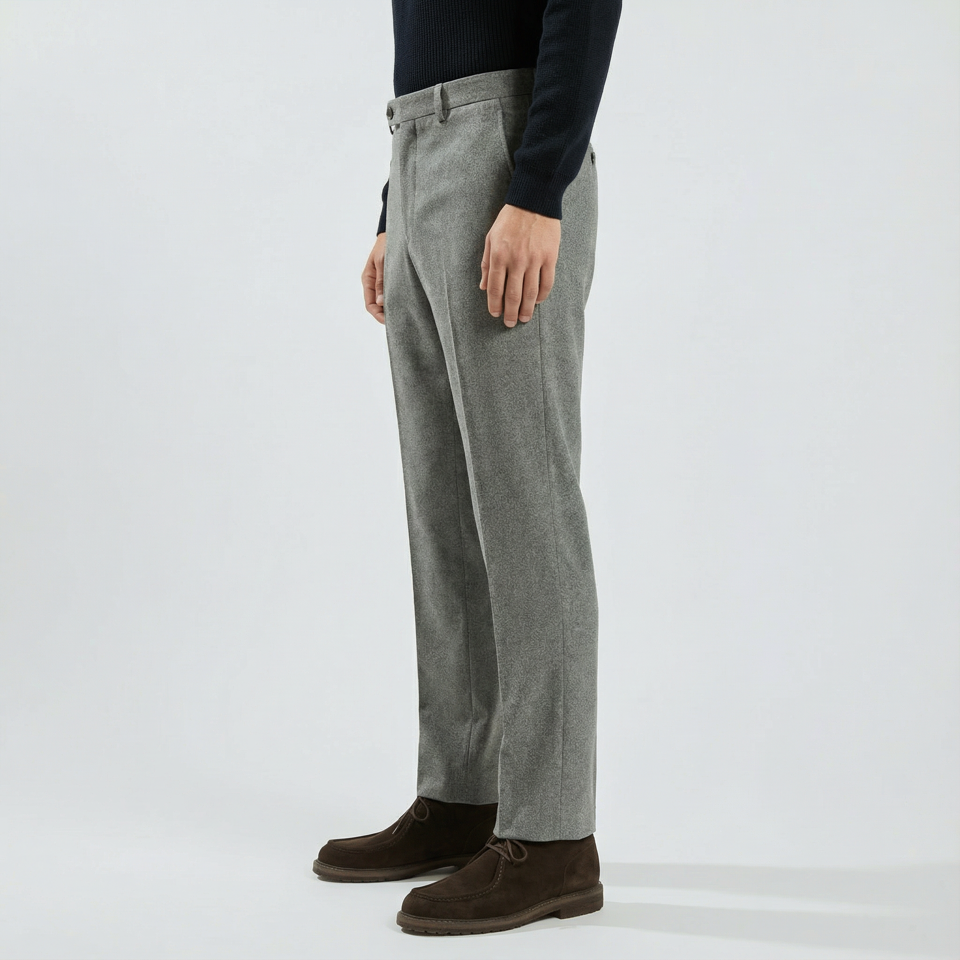 Die Hose FW Signature Flanell Classic Grey von Suitery kombiniert luxuriöse Materialien mit klassischem Design. Gefertigt aus feinstem Flanell-Schurwolle-Stoff von Vitale Barberis Canonico, ist diese Hose der ideale Begleiter für kühlere Tage.
