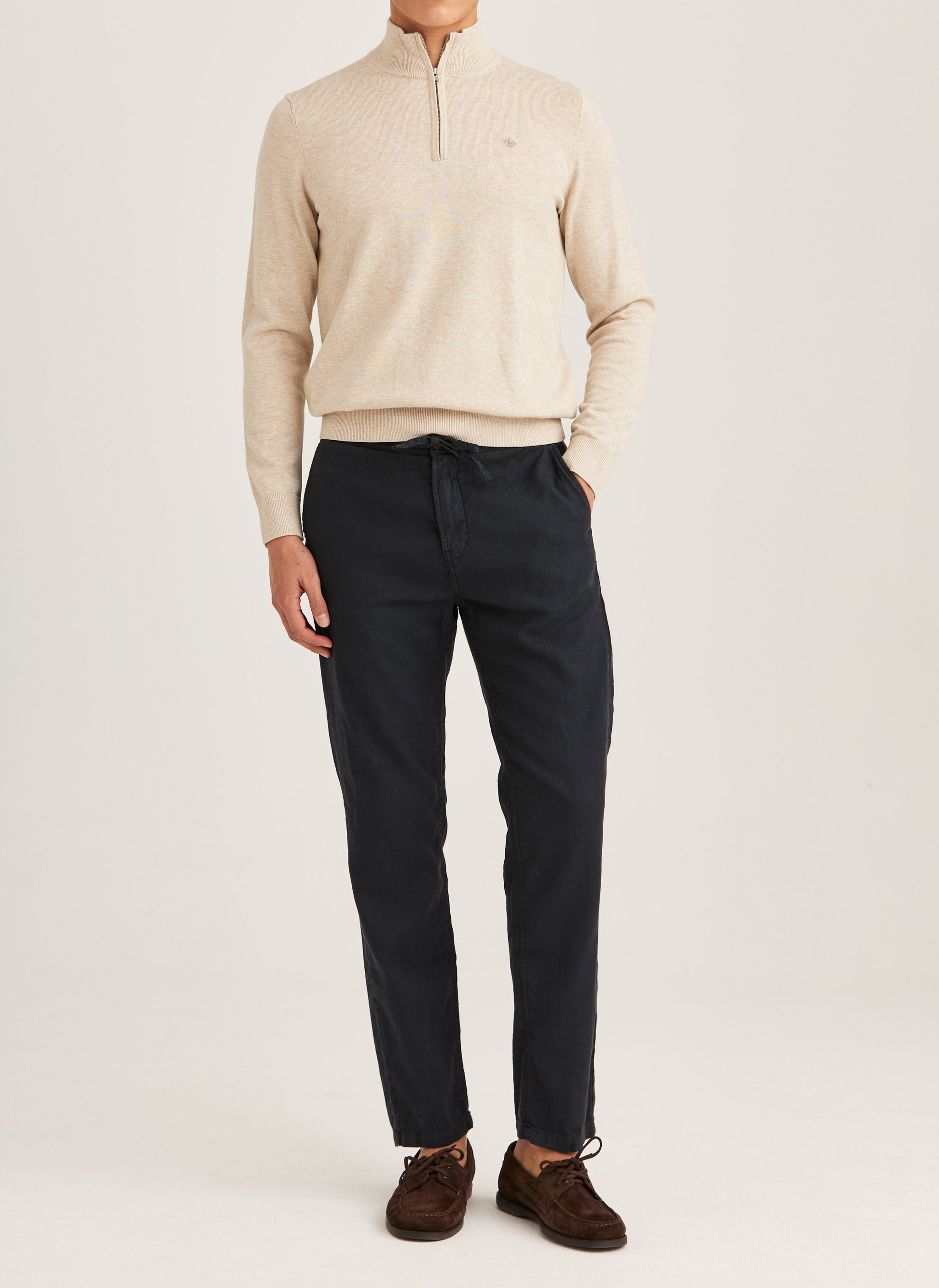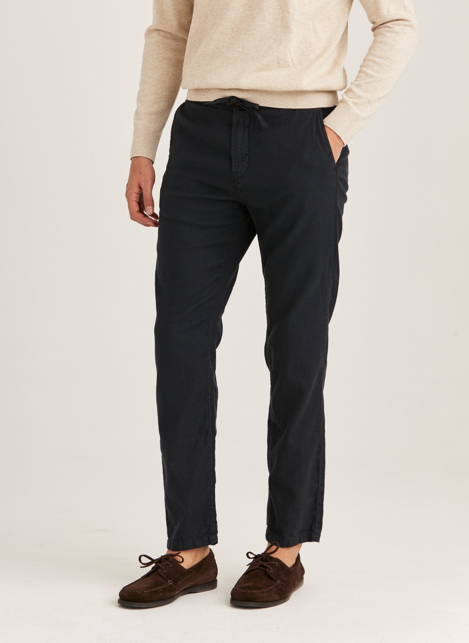 Genießen Sie absolute Sommerentspannung mit der Morris Stockholm Fenix Leinenhose in Marineblau. Der weiche, gewaschene Baumwoll-/Leinenstoff hält Sie kühl und bequem, während die Kordelzug-Taille und der Stretch-Anteil für zusätzlichen Komfort sorgen. Dank des leicht verjüngten Beins verleiht sie Ihnen eine elegante Silhouette. Perfekt kombinierbar mit einem Sommerstrick oder Sängerhemd.