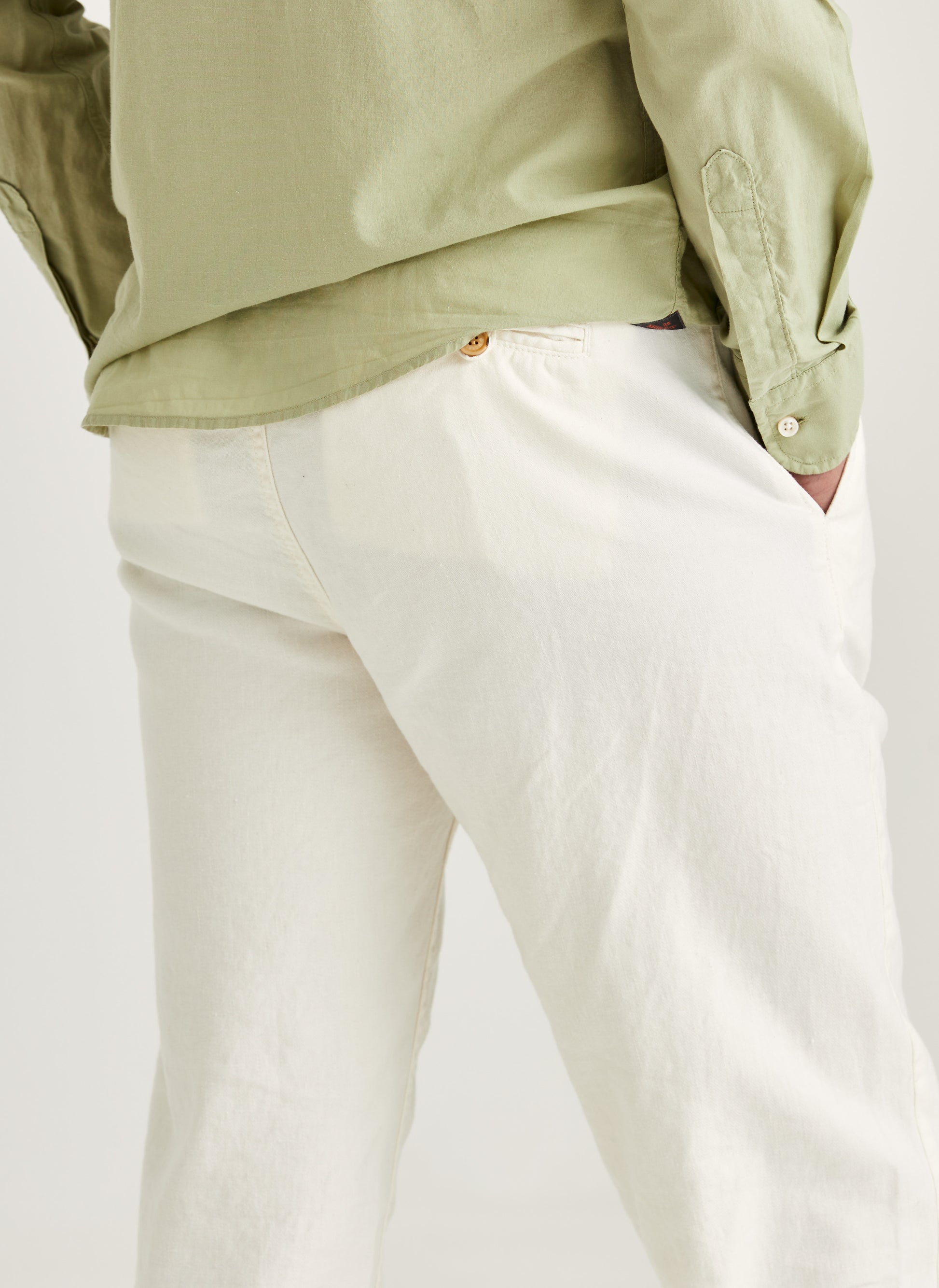 Das Morris Stockholm Fenix Leinenhose in Off White ist perfekt für einen entspannten Sommer geeignet. Der weiche, gewaschene Baumwoll-Leinenstoff hält Sie angenehm kühl und bequem. Die hochwertige Twill-Qualität mit 4% Elasthan und die Kordelzug Taille bieten zusätzlichen Komfort. Die leicht verjüngten Beine sorgen für eine elegante Silhouette. Kombinieren Sie die Hose mit einem leichten Strick oder einem lässigen Hemd für den perfekten Sommer-Look.