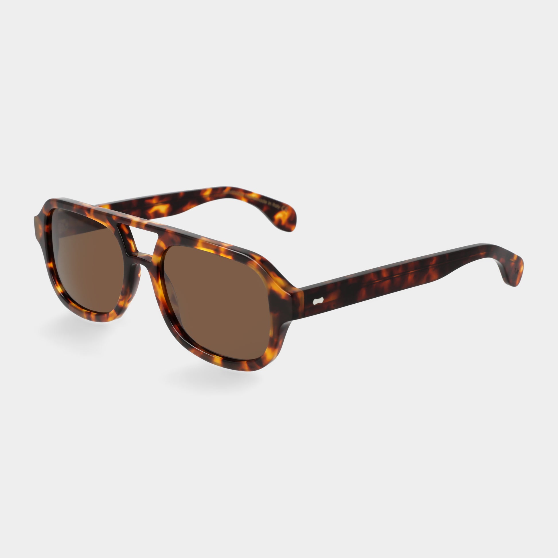 Der Pilotenrahmen in Kombination mit den tabakfarbenen Gläsern erinnert an eine Vintage-Ästhetik, während der doppelte flache Steg einen strukturierten und bequemen Effekt erzeugt. Die dünnen und leichten Bügel gleichen das Design aus und bieten einen bequemen und stabilen Sitz. Dieses fachmännisch handgefertigte Modell mit normaler Passform aus Bioacetat betont die Merkmale verschiedener Gesichtsformen.