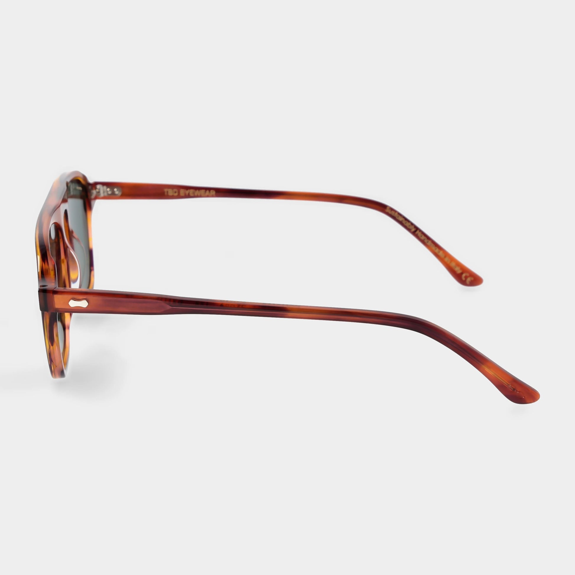 Die Panama-Sonnenbrille zeichnet sich durch einen Pilotenrahmen in Havanna-Tönen aus, kombiniert mit grünen Tropfengläsern, für eine Unisex-Ästhetik mit Vintage-Referenzen. Bioacetatrahmen und biobasierte Gläser für ein absolut nachhaltiges Accessoire.