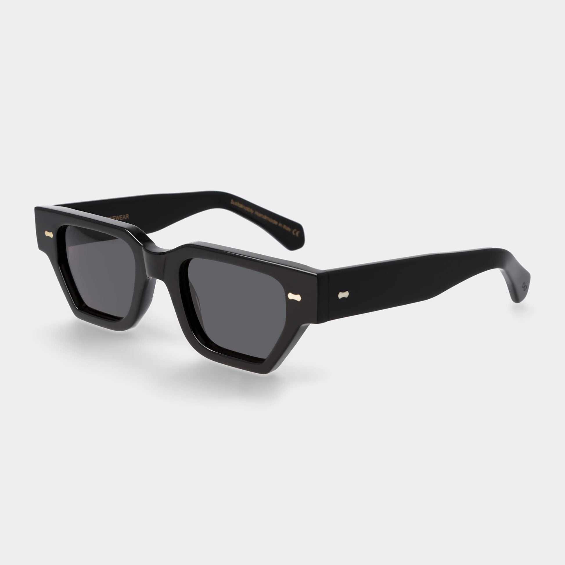 Diese in Italien aus Bioacetat gefertigte kastenförmige Sonnenbrille mit breiten Bügeln kombiniert graue biobasierte Gläser mit einem schwarzen Rahmen. Ein Muss für einen eleganten und zeitgemäßen Total-Black-Look.