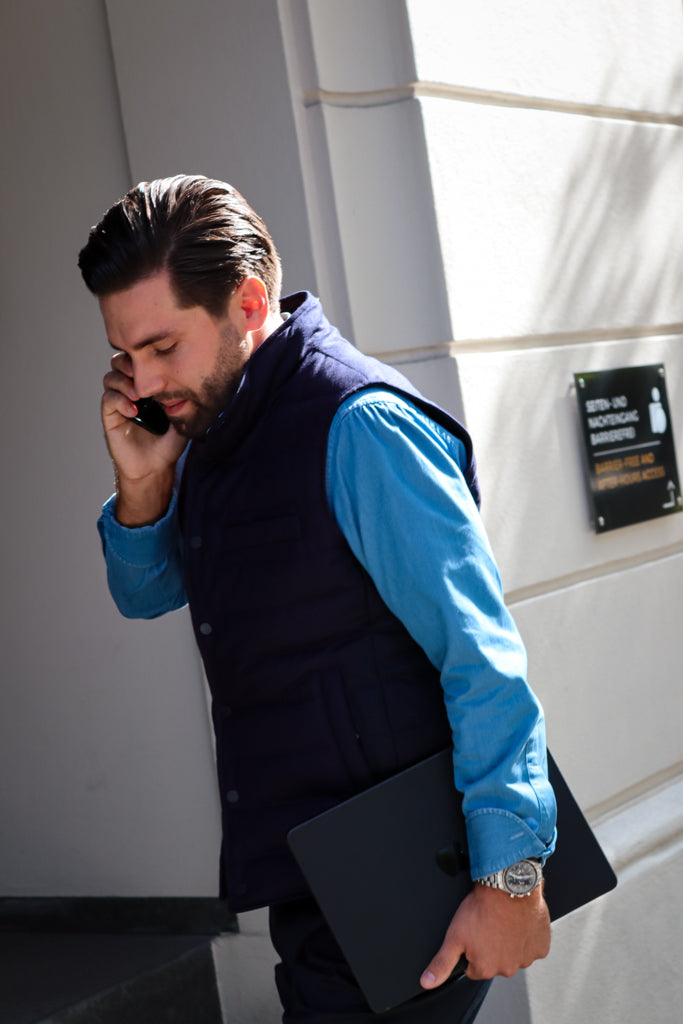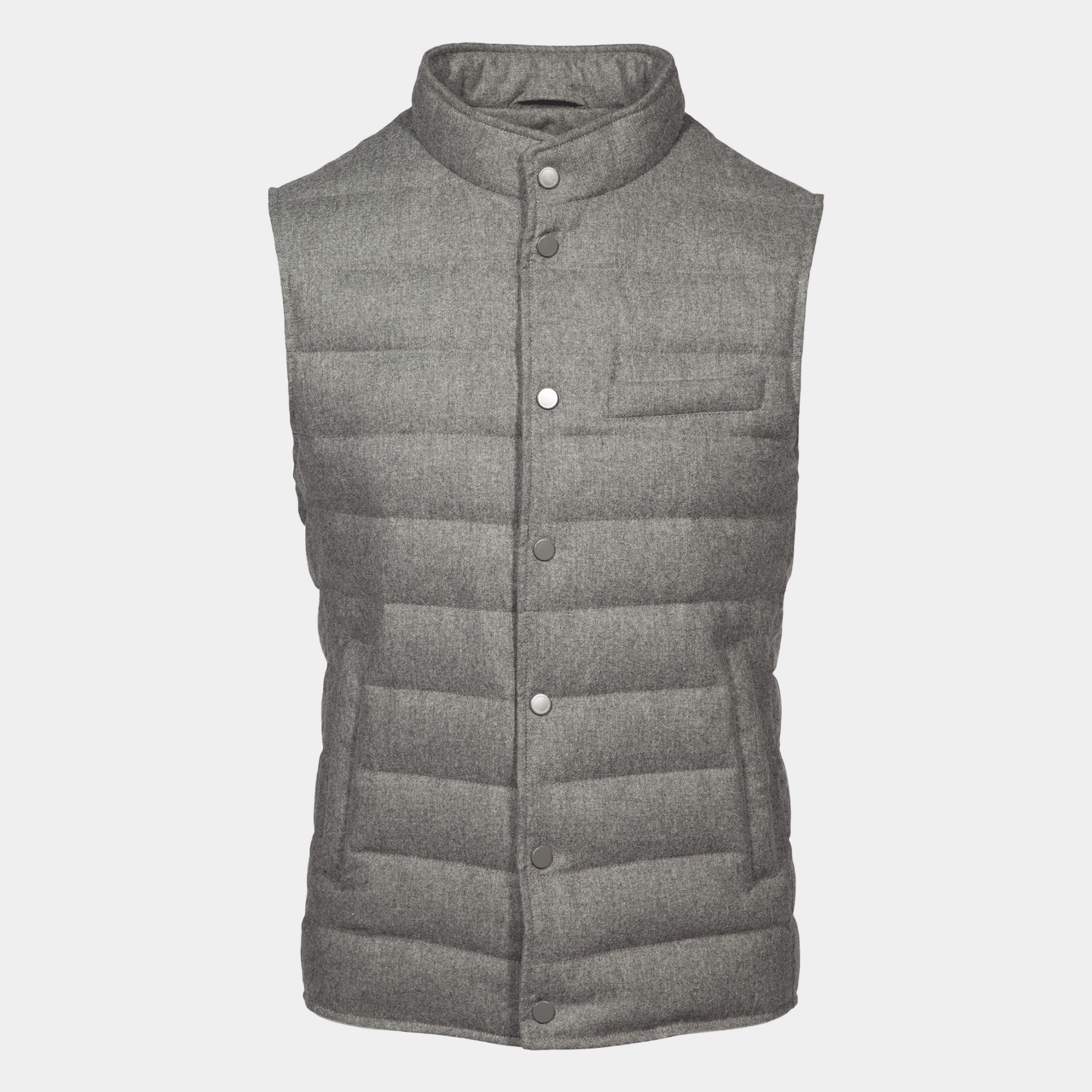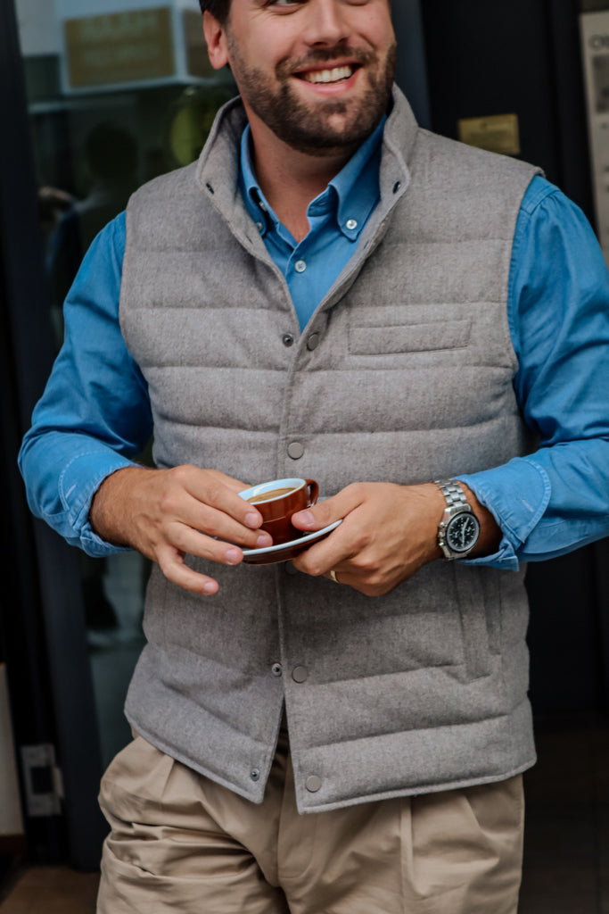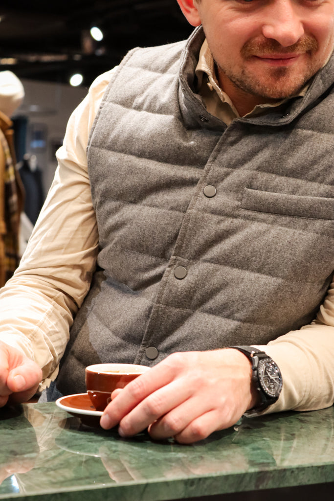Entdecken Sie die Suitery Steppweste in edlem Grey mit Flanelloberfläche aus dem hochwertigen Stoff von Vitale Barberis Canonico. Die Daunensteppung sorgt für Wärme und Komfort, während das zeitlose Design von Suitery Ihnen einen eleganten Look verleiht. Perfekt für kühle Tage und ein Muss für jeden Kleiderschrank.