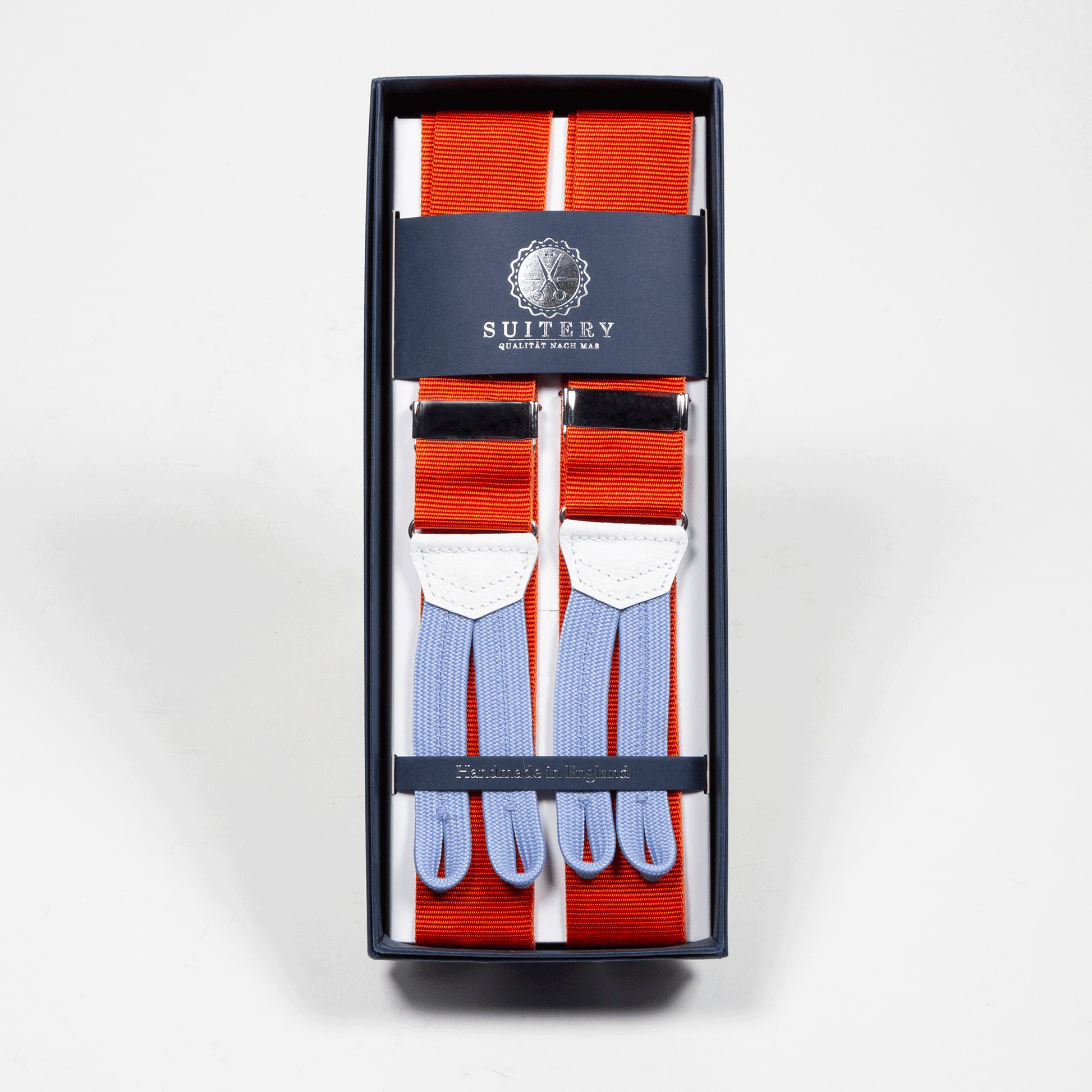 Bringen Sie Farbe und Stil in Ihre Garderobe mit den Suitery Hosenträgern in Orange Blue. Diese breiten Hosenträger kombinieren ein auffälliges Design mit hochwertiger Handwerkskunst und sind die perfekte Wahl für Männer, die ein modisches Statement setzen möchten.
