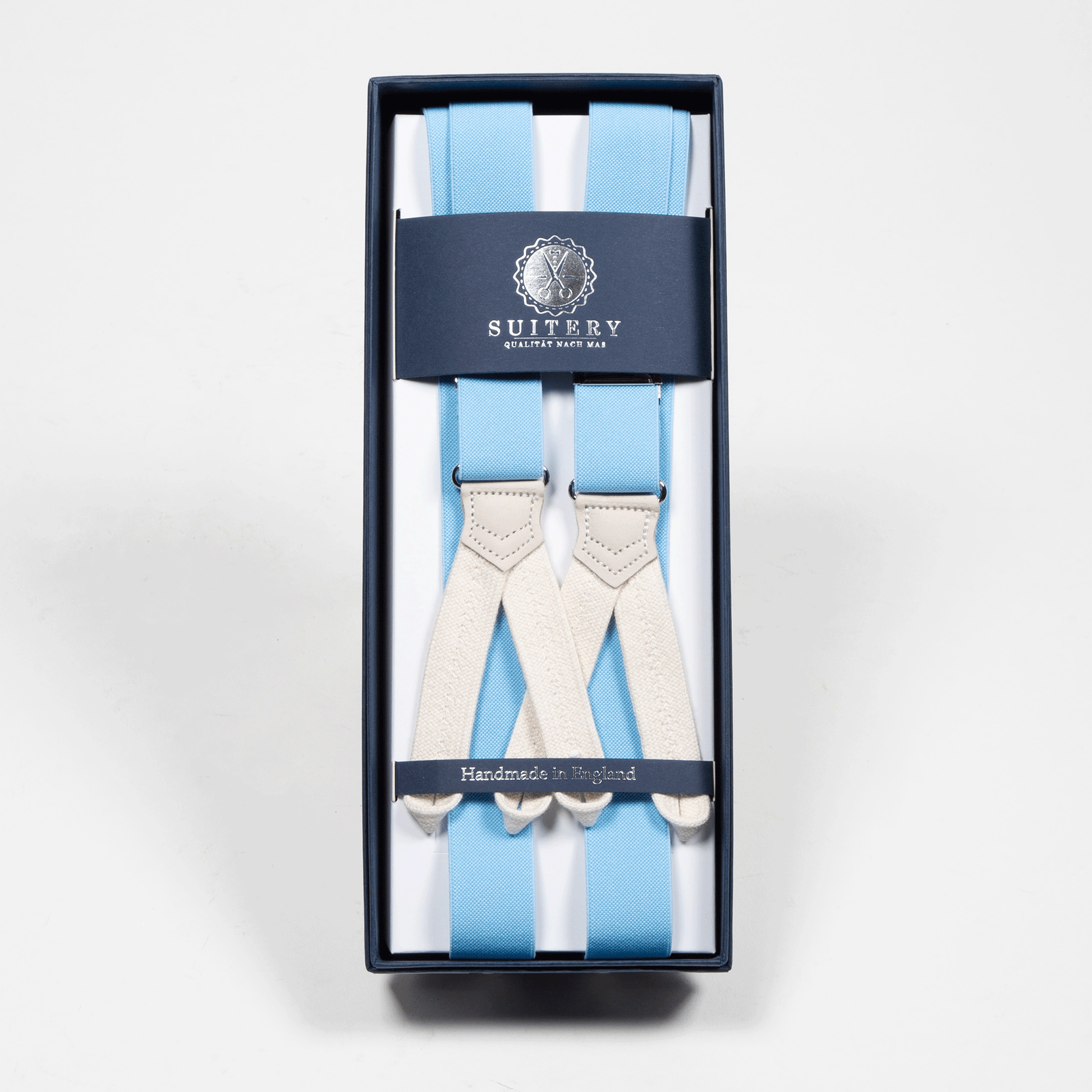 Handgefertigt in England, stehen diese schmalen Hosenträger für höchste Qualität und präzise Verarbeitung. Die geknöpften Befestigungen bieten sicheren Halt und unterstreichen den klassischen, zeitlosen Charakter.