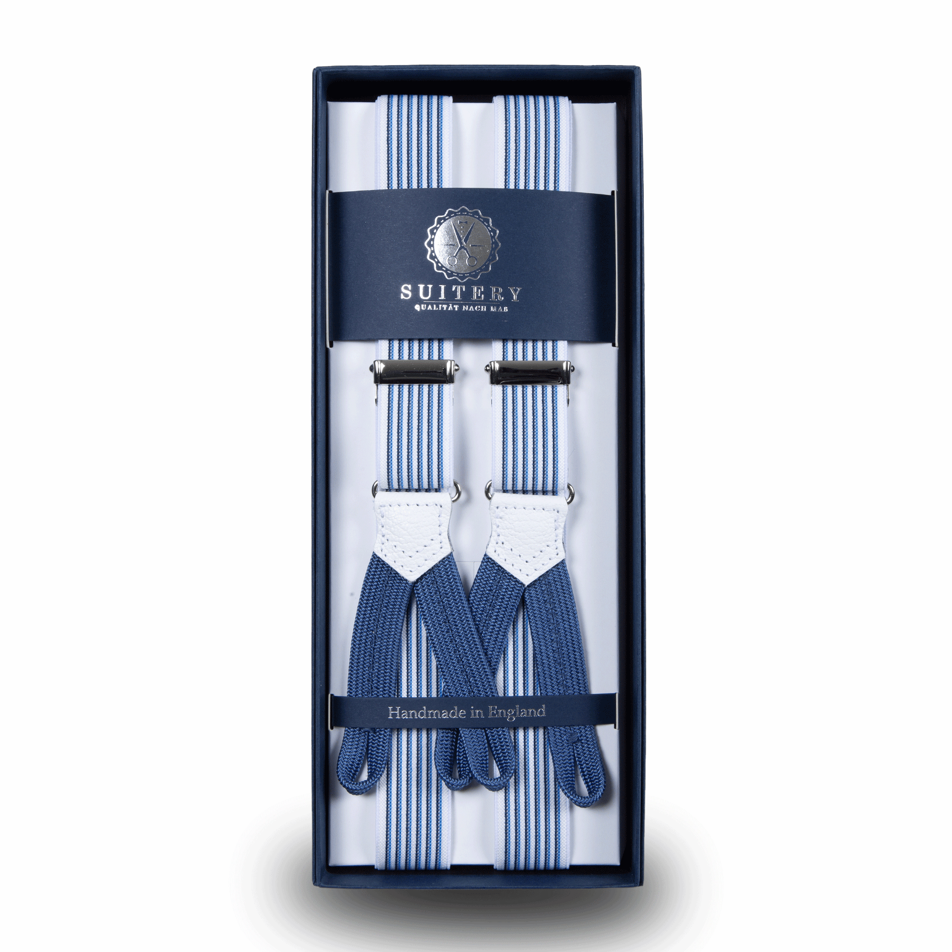 Elegante Suitery Hosenträger mit blau-weißen Streifen, die durch Knöpfen angebracht werden.
