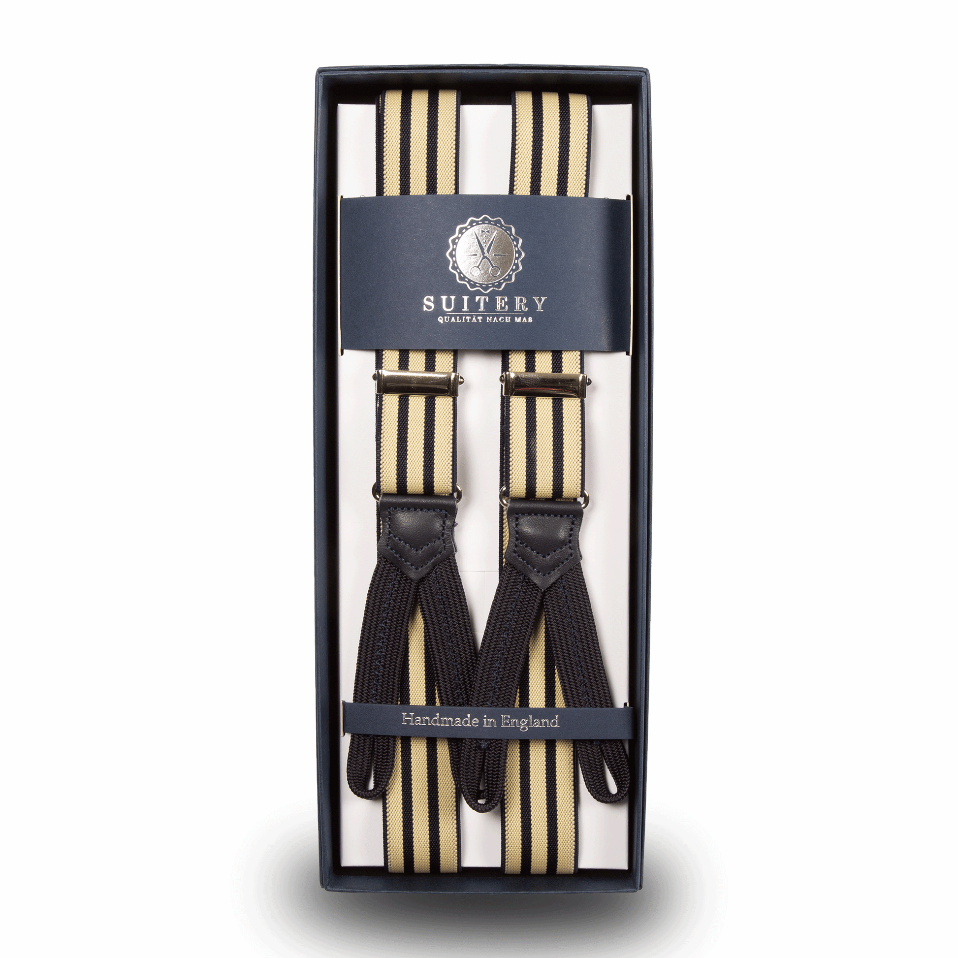 Handgefertigt in England, überzeugen diese schmalen Hosenträger durch erstklassige Verarbeitung und hochwertige Materialien. Die geknöpften Befestigungen sorgen für sicheren Halt und ergänzen den traditionellen Stil.
