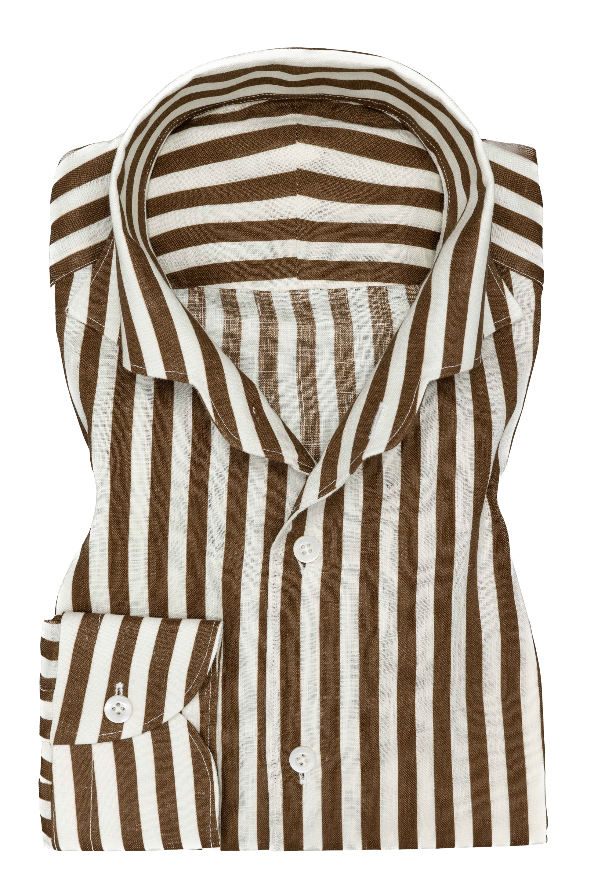 Ein exquisites Leinenhemd in Weiß mit markanten braun Streifen. Die Suitery Sommer Collection verbindet höchste Schneiderkunst mit atmungsaktiver Leinenqualität für optimalen Tragekomfort an warmen Tagen. Die präzise Maßanfertigung garantiert eine perfekte Passform, während das elegante Streifendesign sowohl im Business-Kontext als auch bei gehobenen Freizeitanlässen überzeugt.