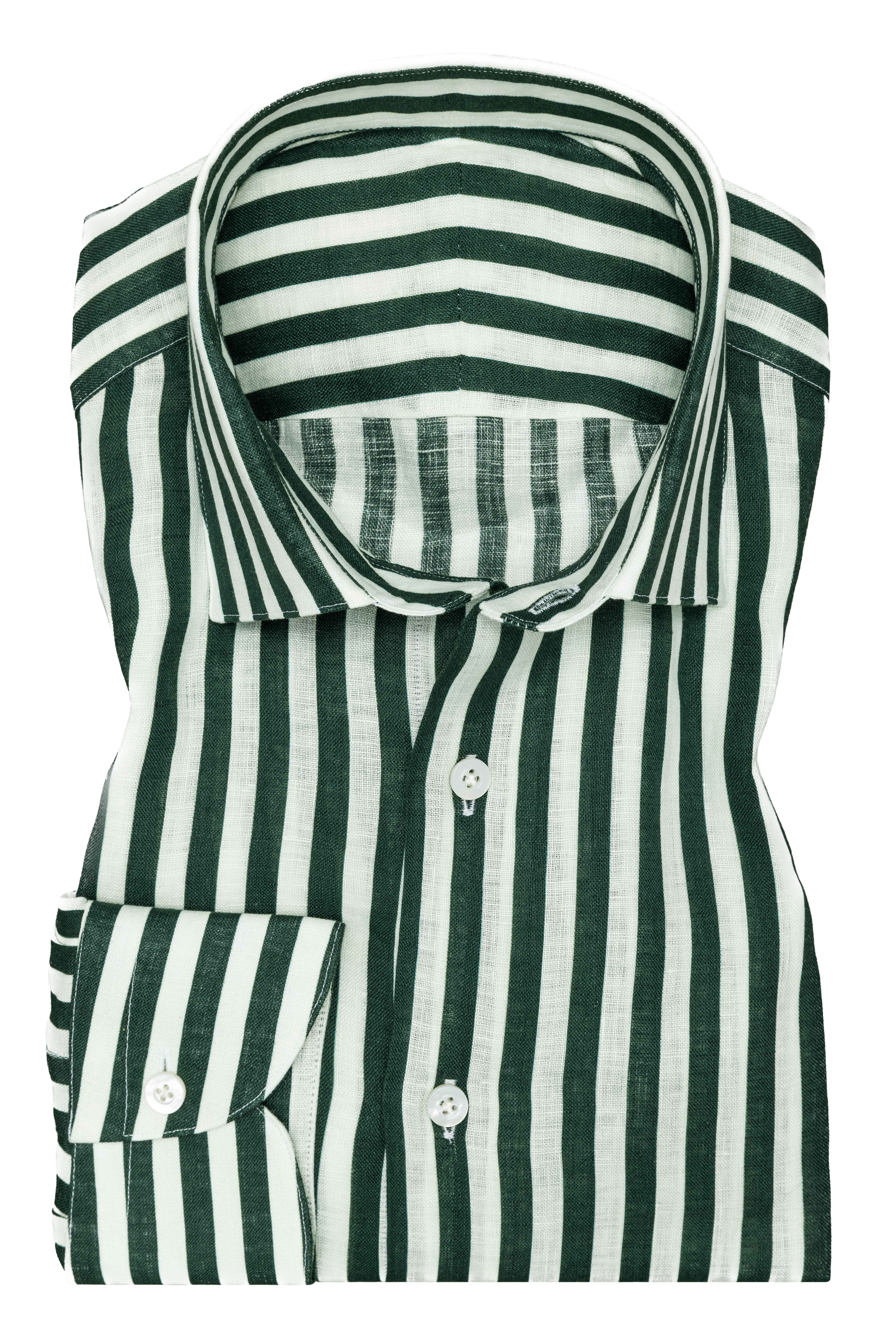 Ein exquisites Leinenhemd in Weiß mit markanten flaschengrünen Streifen. Die Suitery Sommer Collection verbindet höchste Schneiderkunst mit atmungsaktiver Leinenqualität für optimalen Tragekomfort an warmen Tagen. Die präzise Maßanfertigung garantiert eine perfekte Passform, während das elegante Streifendesign sowohl im Business-Kontext als auch bei gehobenen Freizeitanlässen überzeugt.