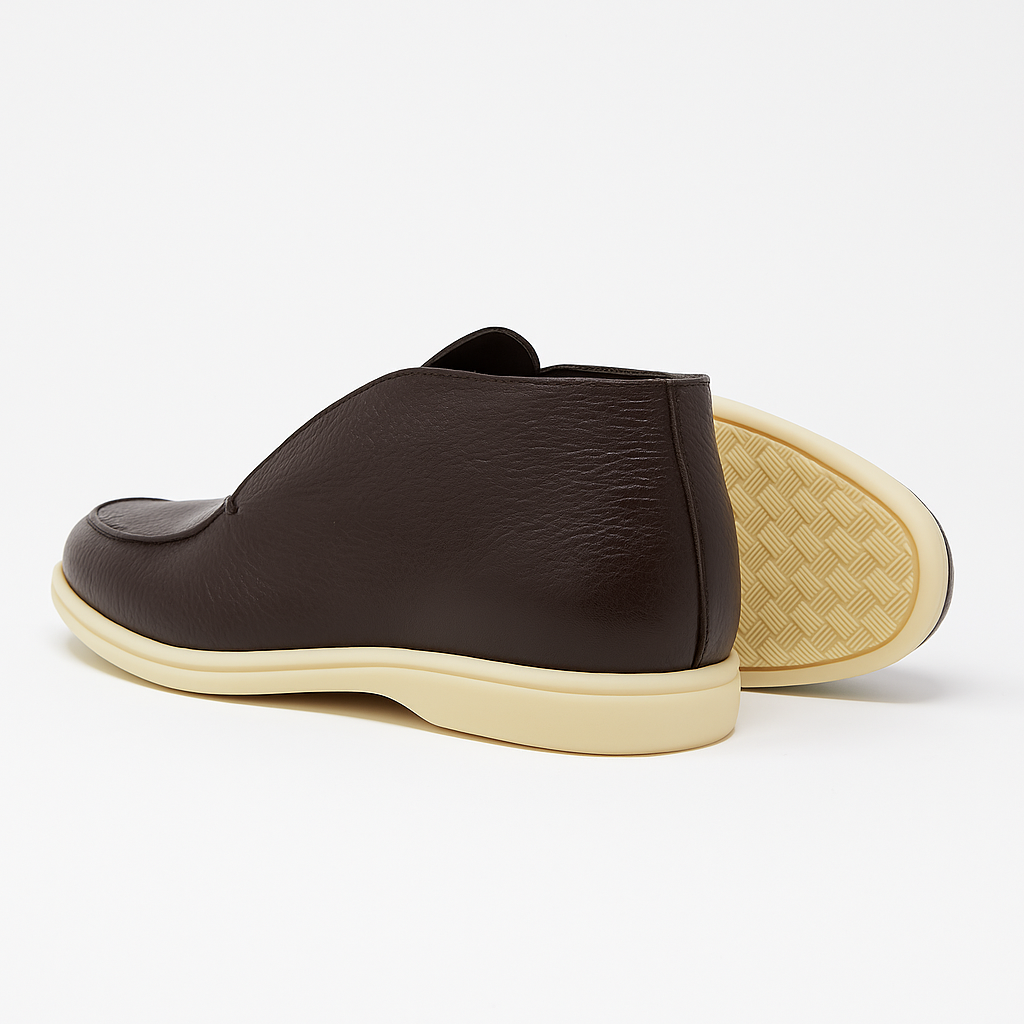 Handgefertigte Yanko Hightop Loafer aus genarbtem Leder in dunklem Braun. Hergestellt in Spanien, bieten sie höchste Qualität und Stil. Perfekt für jeden Anlass, verleihen sie jedem Outfit einen Hauch von Eleganz. Ein Must-Have für jeden Schuhschrank.
